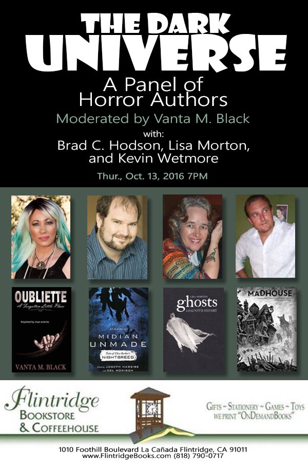 9/16/16 - La Cañada Flintridge, CA - In keeping with the Halloween spirit, on Thursday, October 13, at 7 P.M., Flintridge Bookstore & Coffeehouse presents a panel discussion, THE DARK UNIVERSE, featuring four Los Angeles area horror authors. The event is moderated by Vanta M. Black, who describes herself as an “explorer of the esoteric.” She is joined by novelist and screenwriter Brad C. Hodson; screenwriter and Halloween expert Lisa Morton; and actor, theater professor and comedian Kevin Wetmore. They share insights about their books and discuss horror/science fiction writing genres – with a Halloween twist to celebrate the season.